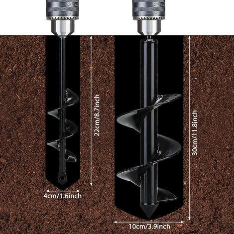 Outil de plantation pratique pour les jardiniers: Cet Perceuse de Tarière comprend deux tailles différentes pour répondre à vos besoins: le grand foret de 4 * 12 pouces convient pour creuser des trous grands et profonds (30 x 10 cm), tandis que le petit 1,6 * 9 Le foret en pouces est destiné aux petits trous peu profonds (22 x 4 cm). Fonctionne avec chaque perceuse hexagonale de 3/8 po ou plus, une perceuse de 14 V ou plus recommandée;