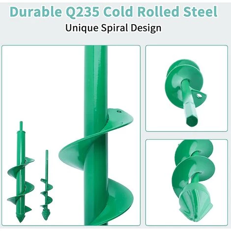 UTILISATIONS MULTIPLES : Cette perceuse hélicoïdale est le choix du jardinier professionnel. Vous pouvez faire pousser des bulbes, des plantes en pot, des légumes, des fleurs, des arbres et des arbustes avec du terreau ou dans des pots mélangés avec des graines, de la terre et de l’engrais. Les excavatrices vous aident à gagner du temps lors de la plantation. Ils vous rendent plus efficace. Conception de lame unique : la conception inclinée de la lame de la tarière de jardin vous aide à percer plus facilement différents types de sol. Il transporte également rapidement la saleté hors du trou. La distance entre le bas de la lame et la pointe de la tarière de jardin est conçue pour être minimale. En conséquence, la tarière peut rapidement commencer à travailler sur un sol dur sans pousser vers le bas. Matériaux de qualité supérieure : la pelle est fabriquée en acier robuste avec une peinture de qualité supérieure pour une longue durée de vie. Marche avec tout collier ajustable. La perceuse de jardin peut être utilisée avec n’importe quelle perceuse sans fil avec des clips réglables. Compatible avec n’importe quelle perceuse à pince de 10 mm ou plus.