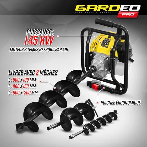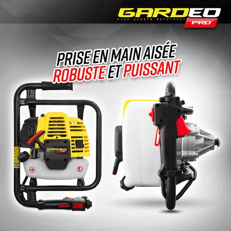 Robuste et puissante, cette tarière thermique de la marque Gardeo Pro est l’outil parfait pour pour la pose de piquets, le plantage d’arbre….. Elle est équipée d’un moteur thermique à 2 temps 52 CC refroidi par air. Conçue de manière ergonomique, elle est facile à prendre en main.