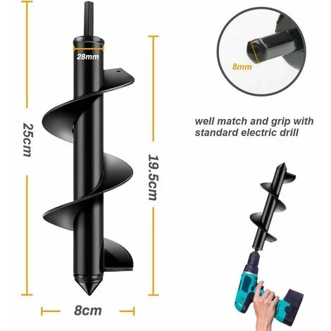 Le foret hélicodal extra solide et durable de la tarière s’adapte facilement à n’importe quel foret standard pour garantir des performances d’excavation maximales.Excellent outil pour creuser le hool de la surface de la terre ou de la glace et pour creuser rapidement jusqu’à (8) pouces de profondeur et 8 pouces de largeur.